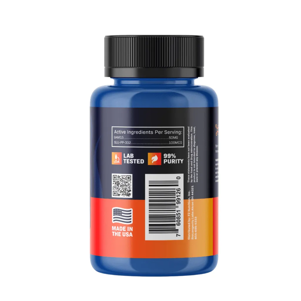 - SLU-PP-332 (100mcg per capsule): A synthetic exercise mimetic that activates all three estrogen-related receptors (ERRα, ERRβ, ERRγ), stimulating mitochondrial biogenesis, fatty acid oxidation, and endurance-related gene expression.